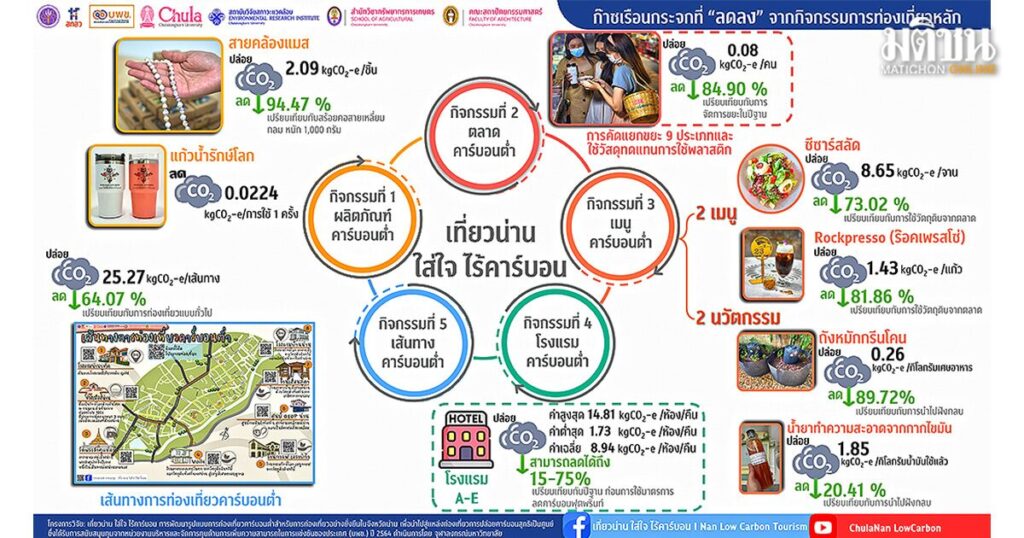 - การท่องเที่ยวแบบคาร์บอนต่ำช่วยลดการปล่อยก๊าซเรือนกระจกได้ 45.05 kgCO2e/ทริป