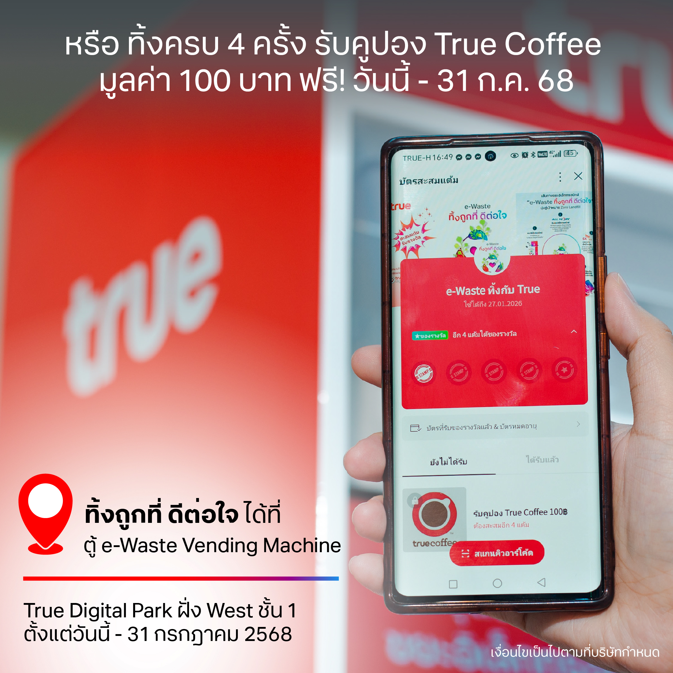 ใครที่อยากลองใช้ตู้ “ทิ้งถูกที่ ดีต่อใจ” มาลองได้เลยที่ True Digital Park ฝั่ง West ชั้น 1 เพราะแค่คุณ ทิ้งขยะ e-Waste ครบ 4 ครั้ง ก็รับไปเลยทันที คูปอง True Coffee มูลค่า 100 บาท!