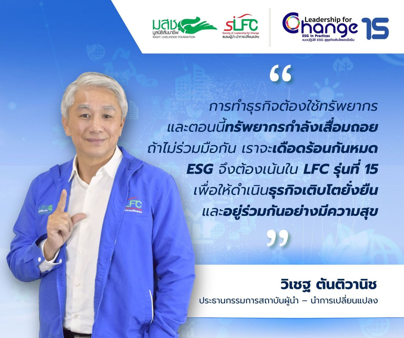 เนื้อหาของหลักสูตร LFC 15 จะให้ข้อมูลและแนวทางปฏิบัติเกี่ยวกับ ESG ในแต่ละด้านเพื่อให้องค์กรนำไปปรับใช้ ลดความเสี่ยง สร้างโอกาสใหม่และการเติบโตที่ยั่งยืน” นายวิเชฐกล่าว
