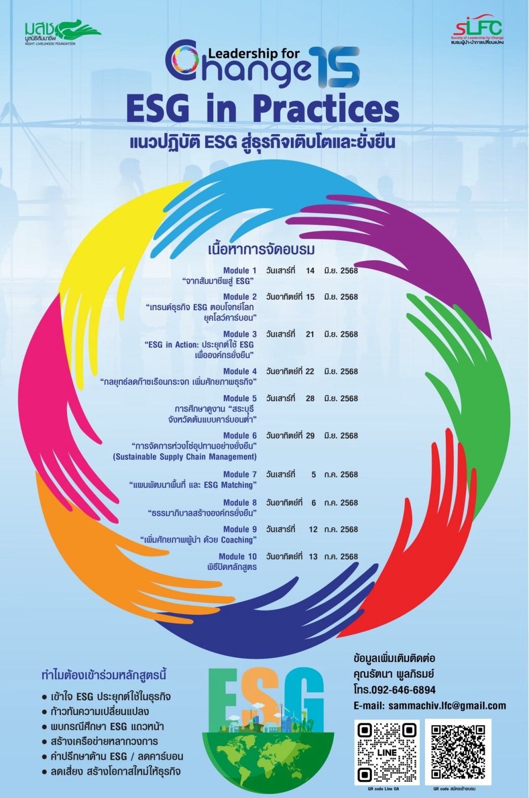 มูลนิธิสัมมาชีพเปิดหลักสูตรผู้นำ-นำการเปลี่ยนแปลง รุ่นที่ 15 “ESG in Practicesเป้าหมายสร้างความร่วมมือ ผู้นำองค์กร ทั้งภาคธุรกิจ ภาครัฐ และภาคประชาสังคม รับมือกับกติกาใหม่โลก ที่ให้ความสำคัญกับสิ่งแวดล้อม สังคม และธรรมาภิบาล เผยจุดเด่นหลักสูตรองค์ความรู้ลึกด้าน ESG จากผู้เชี่ยวชาญระดับประเทศ พร้อมกรณีศึกษาจริงจากองค์กรชั้นนำ ที่ประสบความสำเร็จในการขับเคลื่อน ESG