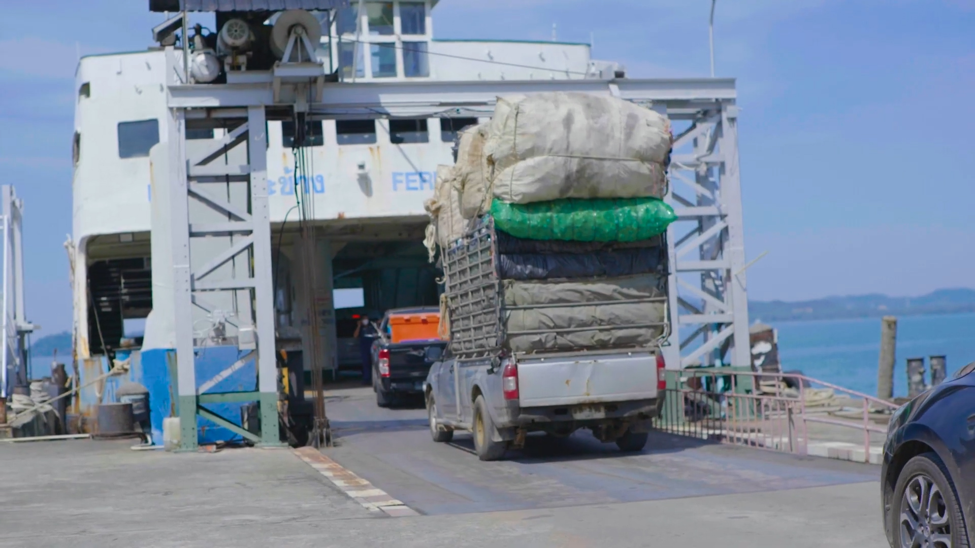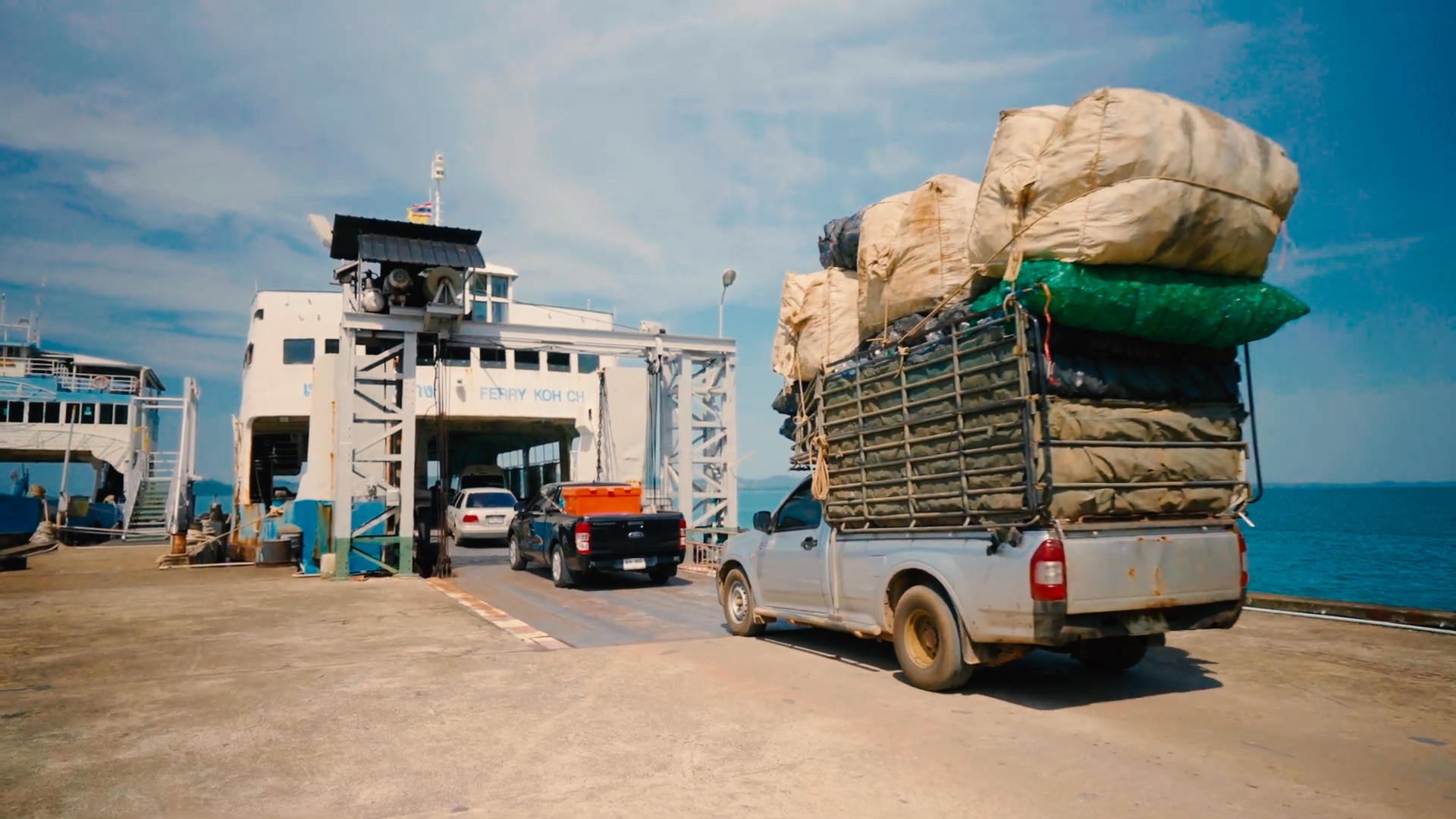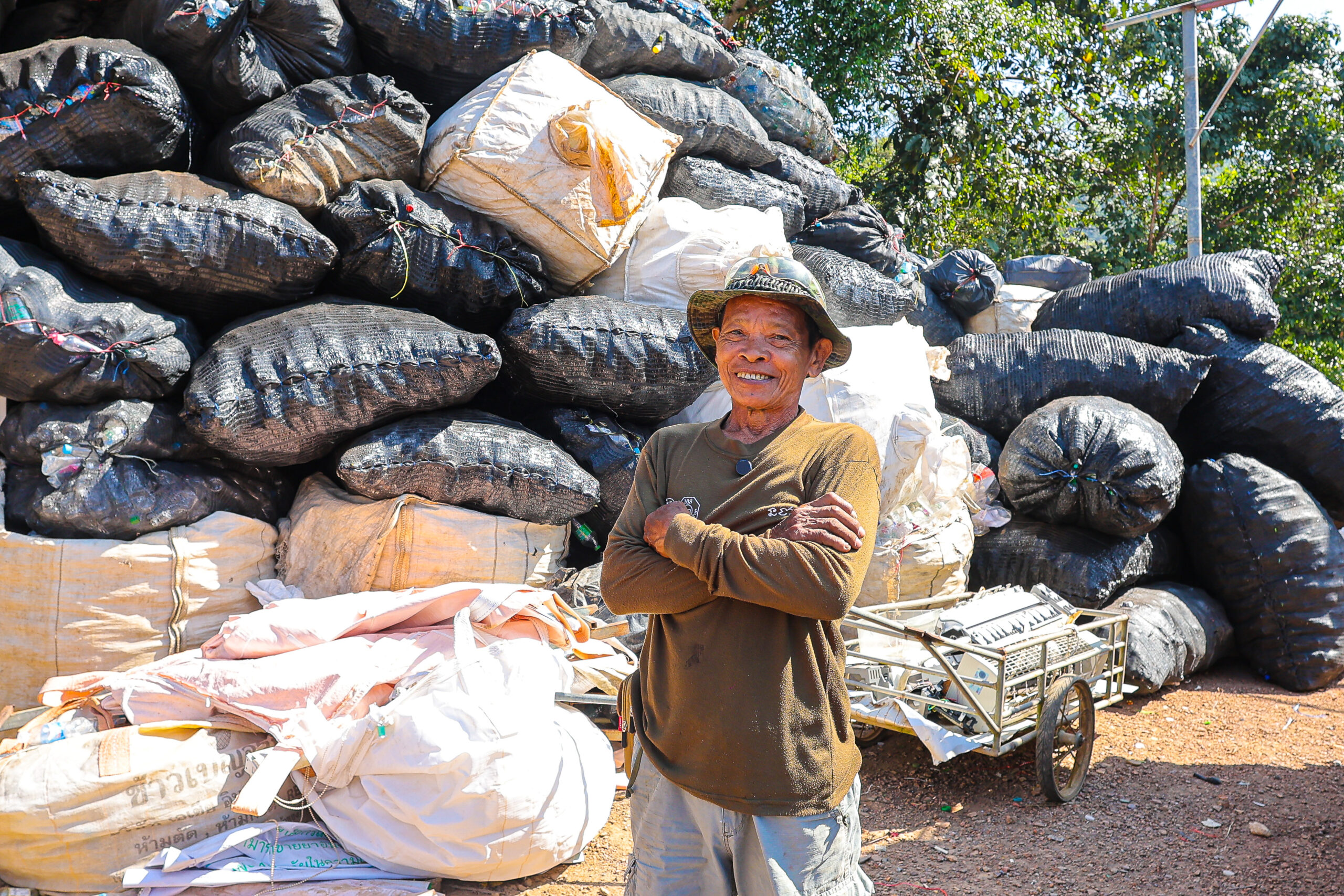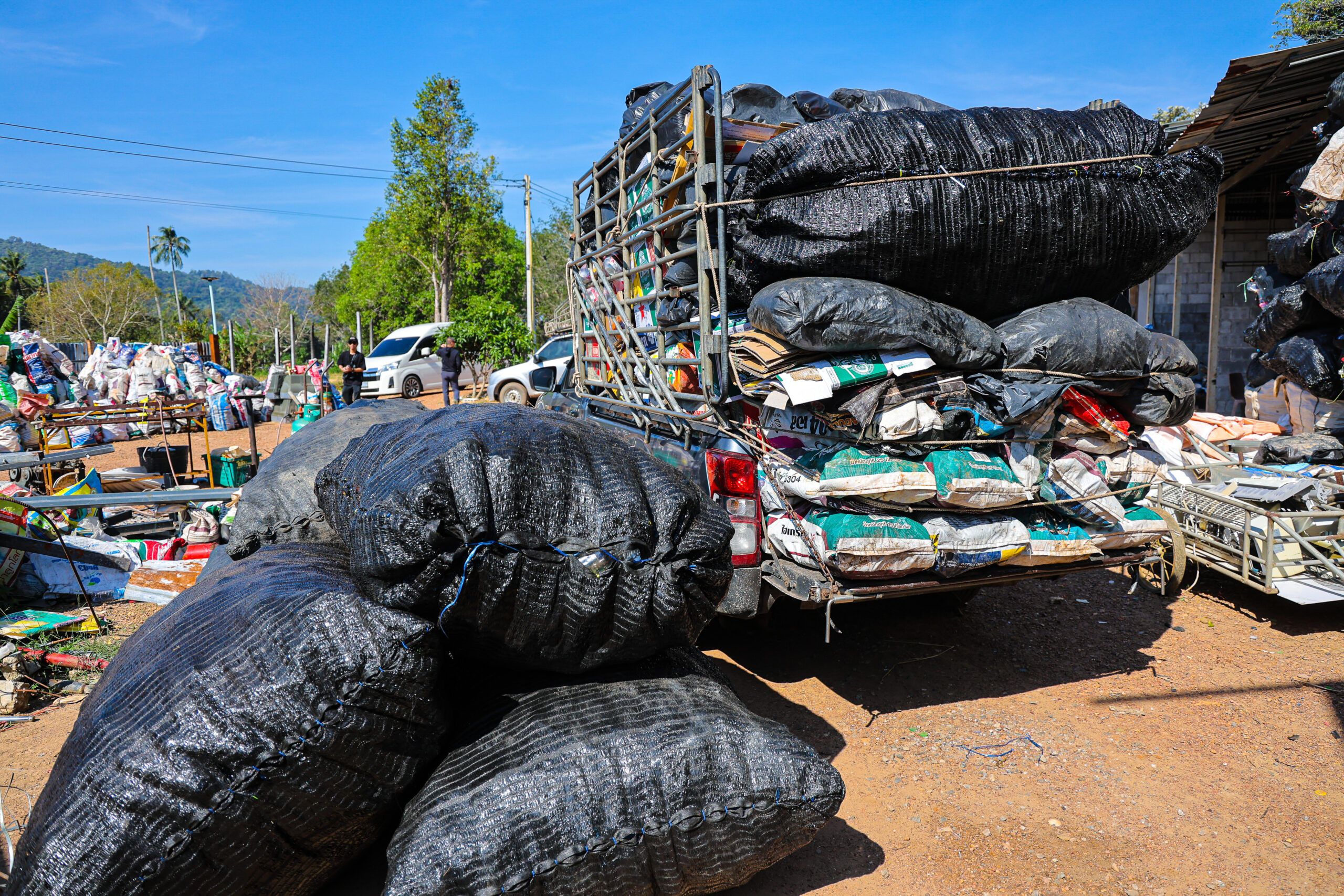 นายเฉลย ชลสินธ์ หนึ่งในผู้ประกอบการรับซื้อของเก่าบนเกาะช้าง จ.ตราด กำลังขนวัสดุรีไซเคิลขึ้นรถเพื่อนำออกจากเกาะ