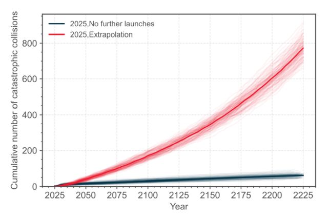 กราฟที่แสดงจำนวนการชนกันในอวกาศที่เพิ่มขึ้นในอัตราการปล่อยต่อเนื่องในปี 2025 (สีแดง) และหากไม่มีการปล่อยวัตถุเพิ่มเติมอีก (สีน้ำเงิน) (ESA)