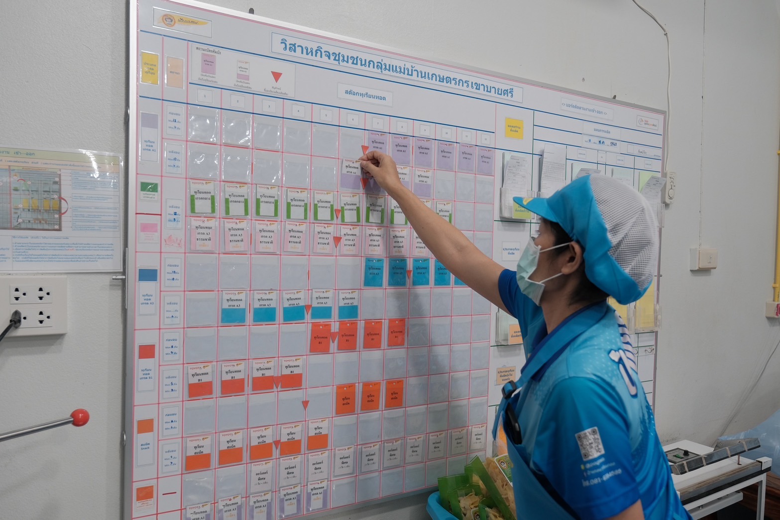 จากเดิมที่เคยประสบปัญหาการคัดแยกเกรดทุเรียน เนื่องจากมีปริมาณมากและมีหลายเกรดวางปะปนกัน จนทำให้พนักงานไม่สามารถแยกลำดับความสุกและลำดับการนำไปผ่าก่อน-หลังได้ จนทำให้มีจำนวนทุเรียนตกค้างเนื่องจากสุกเกินกว่าจะนำไปผ่าเพื่อทอดเป็นทุเรียนทอด ถือเป็นความสูญเปล่าด้านวัตถุดิบ ทางโตโยต้าแนะนำการใช้เข่งแยกสีสำหรับแต่ละเกรด พร้อมกำหนดจุดวางให้ชัดเจน ทำให้พนักงานสามารถเรียงลำดับการผ่าทุเรียนได้อย่างถูกต้อง ลดของเสียได้ถึง 70% และช่วยลดต้นทุนกว่า 480,000 บาทต่อปี