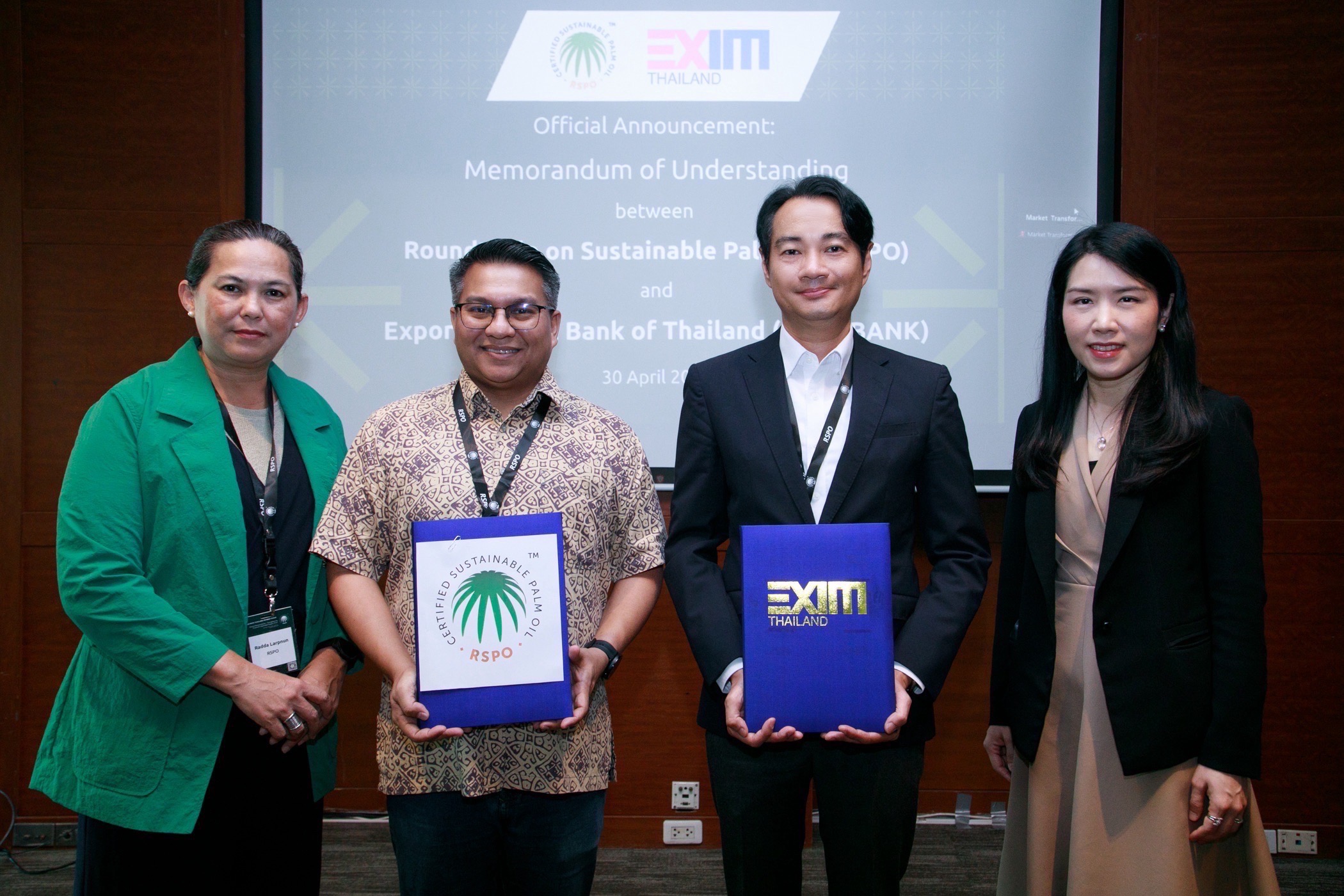 ปัจจุบันไทยป็นผู้ผลิตปาล์มน้ำมันอันดับ 3 ของโลก รองจากอินโดนีเซียและมาเลเซีย ด้วยพื้นที่ปลูกกว่า 6.3 ล้านไร่ ทำให้ไทยถูกจัดให้เป็นหนึ่งในชาติที่มีบทบาทสำคัญในการยกระดับมาตรฐานการผลิตปาล์มน้ำมันของโลกสู่ความยั่งยืน ธนาคารเพื่อการส่งออกและนำเข้าแห่งประเทศไทย (EXIM BANK) จึงได้ร่วมมือกับองค์กรเจรจาระหว่างประเทศว่าด้วยปาล์มน้ำมันยั่งยืน (Roundtable on Sustainable Palm Oil: RSPO) ลงนามในบันทึกความเข้าใจ (MOU) เพื่อสนับสนุนความยั่งยืนในภาคธุรกิจปาล์มน้ำมันของไทย พร้อมทั้งสนับสนุนให้ผู้ประกอบการไทยยกระดับการดำเนินธุรกิจสู่มาตรฐานสากลและแข่งขันได้อย่างยั่งยืนในตลาดโลก